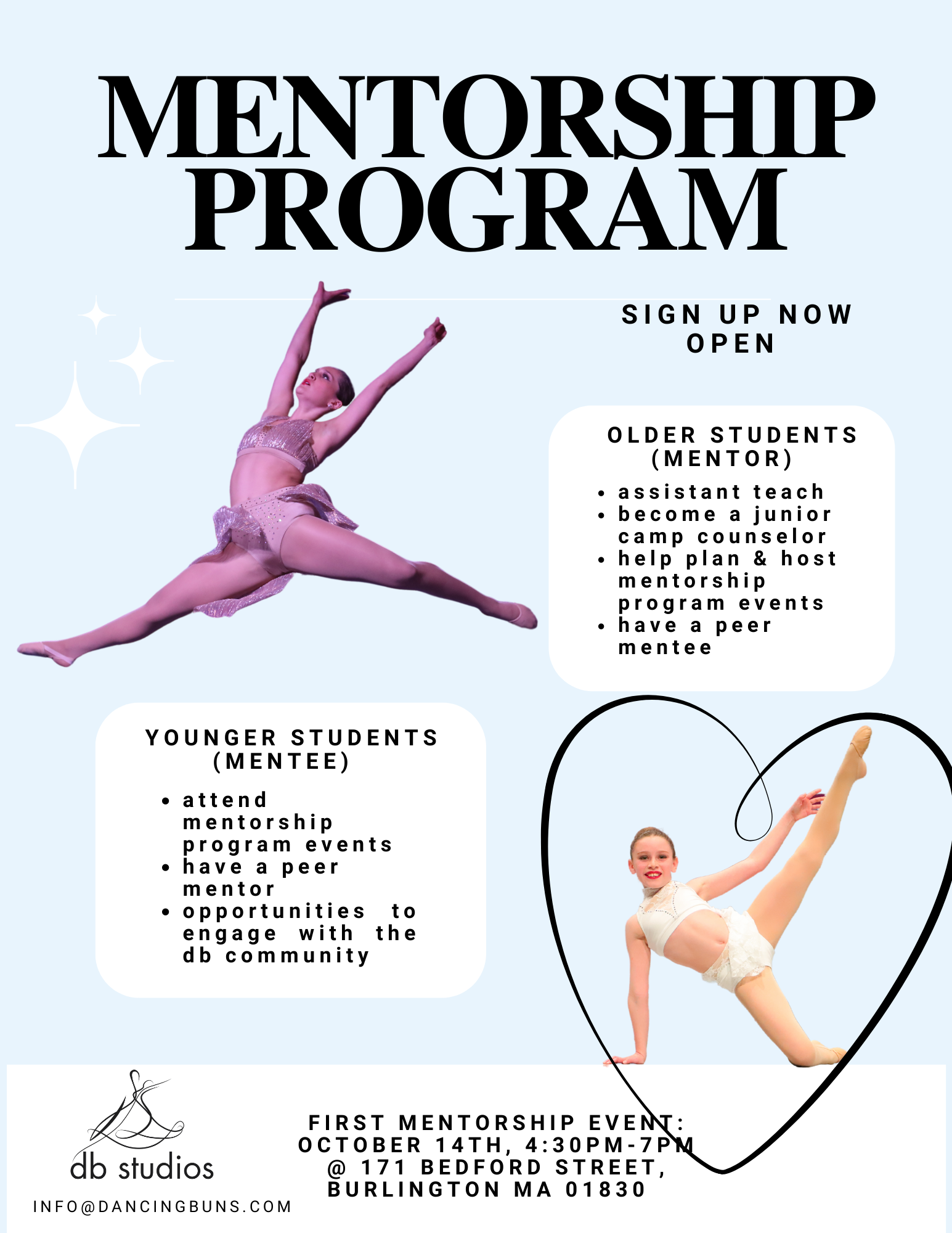 Mentorship pairing and movie night at 171 Bedford Street in Burlington, MA! Younger dancers can leave at 5:30 pm to get home in time for bed.